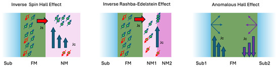 Besides ISHE, other phenomena such as the inverse Rashba–Edelstein effect (IREE) [25] and the anomalous Hall effect (AHE) [26,27,28] also contribute to the functionality of spintronic devices, though they are less commonly associated with the primary THz emission mechanism. Figure 3 provides a visual comparison of ISHE, IREE, and AHE, emphasizing their distinct operational contexts within the STEs.