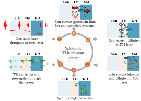 In spintronic THz emitters, the generation of terahertz (THz) emission follows a sequence of critical stages, initiated by the excitation of the system with an optical pump laser (process (a) in Figure 4). This pump laser plays a significant role, as it drives the system into an out-of-equilibrium state, enabling the subsequent THz emission processes.