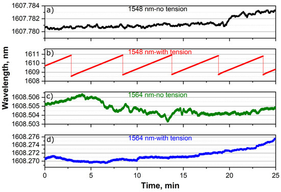 Lasing wavelength dynamics measured at pumping wavelength of 1548 nm (a) without tension and (b) with tension and at a pump wavelength of 1564 nm (c) without tension and (d) with tension.
