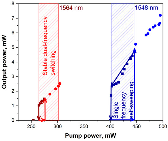 The appearance of fast-intensity modulation could be observed when we stretched the section of the PZF installed in FOPLM. One should note that the generated power was not affected considerably by the stretching. Typical dependence of the output power on the pump is shown in Figure 3 by blue squares and circles. Hysteresis in the output power is typical near the lasing threshold for such lasers with saturable absorbers. As the pump power increases (blue circles), laser generation begins at the upper pump power threshold of ~450 mW. In this case, the output power level increases abruptly to 5.3 mW. The output power increases linearly with the pump up to ~7.3 mW at pump power of 490 mW. The output power reduces linearly down to ~1.5 mW (see blue squares in Figure 3) with reducing the pump to the lower threshold of ~400 mW. The generation wavelength sweeping was observed in the laser in the hysteresis region. The largest sweeping range of 2.2 nm was observed at the output power of 4.5 mW (see Figure 2b). In this case the sweeping rate was 7 pm/s.