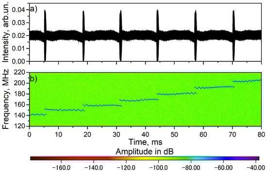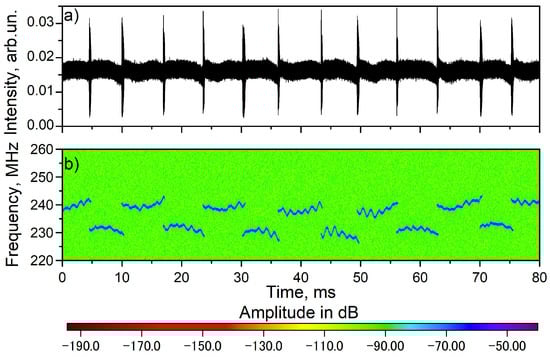 The typical intensity dynamics measured with a digital oscilloscope (CW signal with periodical bursts) is presented in Figure 4a. A heterodyne signal was also measured synchronously. The result of the heterodyning signal processing is presented in Figure 4b. Comparison of Figure 4a,b shows that periods of CW lasing with a duration of ~10 ms correspond to SLM radiation. At the same time, the intensity burst corresponds to moments of mode hopping. In this case, the value of the optical frequency jump corresponds to one free spectral range (FSR) of the cavity of ~10 MHz. It can be seen that hopping occurs in one direction, which indicates sweeping of optical frequency. Also, compared to our previous work [5], the stability of the duration of single-frequency generation has been improved. The SLM duration varies from the generation of one longitudinal mode to another by approximately 10%, and in [5] the duration fluctuated by approximately two times. The full sweeping range of 2.2 nm (demonstrated in Figure 2b) corresponds to ~3100 regular mode hops.