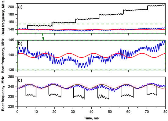 One should note that oscillations of the PZF length also led to a corresponding modulation of the fiber laser cavity length. The result of the latter modulation can be noted in Figure 4b and Figure 5b, where, besides kilohertz modulation associated with operation of the stabilization circuit of the heterodyne laser, additional slow modulation can be noted with a period of ~13 ms. To make these slow modulations in Figure 4b and Figure 5b more obvious, we reconstructed the temporal dependence of the lasing beat frequency in terms of the single cavity mode oscillations in Figure 6a,c, respectively. Let us consider the reconstruction using Figure 6c. The black curve shows the original beat signal presented in Figure 5b. The blue curve is generated from the black one by adding one FSR value of the laser cavity (~10 MHz) to the beat frequencies whose values are below 235 MHz. Thus, the blue curve shows slow temporal oscillations of frequency of a single longitudinal cavity mode, confirming the modulation of the laser cavity length. Fitting of the blue curve by a sinusoidal function is shown by a red one, which demonstrates good periodicity of the mode oscillations. A similar procedure was applied to the beat frequency signal measured at shorter wavelength (1548 nm) pumping shown in Figure 4b. Multiples of FSR values were subtracted from the beat signal to reconstruct temporal dynamics of frequency of a single longitudinal cavity mode in this case. Modulation of the cavity mode frequency is also noticeable in Figure 6b (zoomed-in view of the red and blue curves shown in Figure 6a), but it is partially hidden due to the presence of an additional slow frequency drift. The period of this slow modulation is equal to the mode-hopping period in Figure 4b and is twice as large as the mode-hopping period in Figure 5b. Thus, these results confirm our hypothesis that optical frequency hops in the laser are synchronized with modulation of the laser cavity length.