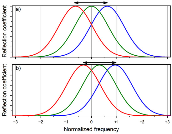 Let us consider qualitatively the effect of such AFLM reflectance spectrum position oscillations on the laser frequency dynamics. For simplicity, let us assume that the AFLM reflectance spectrum is described by a Gaussian function and that the zero mode (lasing mode, which records DPG and produces this resonance structure) has the highest reflection as compared to neighboring ones (green line in Figure 7a). First, let us also assume that the spectrum is centered at the optical frequency of the lasing mode. In this case, the laser will generate in the SLM regime. Let the position of the spectrum oscillate harmoniously in time. Red and blue curves (see Figure 7a) show extreme positions of the spectrum shifted in opposite directions, and the double-sided arrow indicates the region of oscillations of the reflection maximum. If the amplitude of the reflection spectrum position oscillations is smaller than half of the cavity free spectral range (FSR), then the laser will continue lasing in the SLM regime. At larger reflection maximum shifts, another laser cavity longitudinal mode having larger reflectance will accumulate in the cavity faster and the laser will start to oscillate at this new mode. The maximum displacement of about ⅔ of FSR is shown in Figure 7a as such an example. In this case, the laser will hop a mode with either increasing or decreasing number at the extreme positions of the AFLM spectrum (for blue and red lines in Figure 7a, respectively). This case corresponds to experiments with long-wavelength pumping (Figure 5), where the AFLM reflection spectrum begins to move in the opposite direction after each mode hop and a new mode hop takes place at the opposite extreme position in the backward direction again.