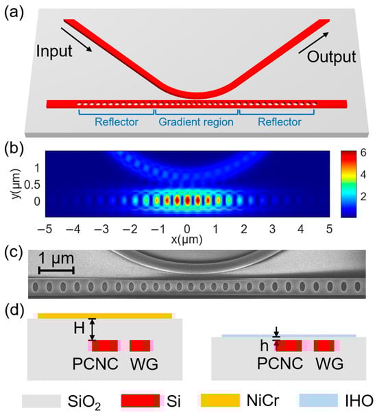 (a) Schematic diagram of the PCNC. (b) Simulated electric field distribution of the PCNC at the resonance wavelength. (c) SEM image of the PCNC. (d) Simplified cross-sectional diagram of the TO switches (not to scale). WG—waveguide. H = 1 μm; h = 200 nm.