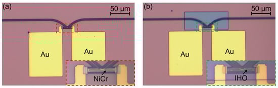 Figure 2a,b present the microscope images of the TO switches with the NiCr microheater and the IHO microheater, respectively. Since they are all fabricated on a silicon-on-insulator (SOI) chip with a top silicon thickness of 220 nm, the 200 nm thick silicon dioxide isolation layer under the IHO microheater is achieved by locally etching 800 nm deep after growing a 1 µm thick silicon dioxide layer on the entire chip. Thus, Figure 2b shows an additional rectangular window of a different color in the coupling region compared to Figure 2a, and it can also be seen that the gold pad in the inset clearly passes through a stepped structure. Then, the IHO microheater is patterned on the PCNC through ultraviolet lithography and the magnetron sputtering process. The dimensions of the IHO microheater and the NiCr microheater are the same. The part covering the PCNC is a rectangle with a length of 22 μm and a width of 2.6 μm. On both sides are rectangles with a length of 4 μm and a width of 6 μm, increasing the contact area with the gold pads.