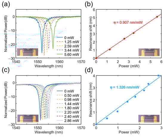 (a,b) Transmission spectra and resonance shifts of the TO switch with the NiCr microheater for different heating powers. (c,d) Transmission spectra and resonance shifts of the TO switch with the IHO microheater for different heating powers.
