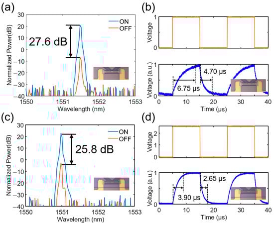 (a,b) The ON/OFF states and the dynamic response of the TO switch with the NiCr microheater. (c,d) The ON/OFF states and the dynamic response of the TO switch with the IHO microheater.