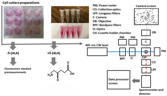 5-ALA administrated MDAs with six different cell amounts were prepared at a concentration of 100 μM in DMEM medium with FBS for 24 h at 37 °C in a standard 6-well cell plate, and they were then removed from the wells by trypsin, dissolved at a 1.5 mL PBS. Based on previous research and experimental considerations, the study set a 24-h incubation time for 5-ALA with cells. Extending this time was challenging due to the large volume of the growth medium of about 3 mL and the difficulties in keeping the cells alive. After multiple tests, 24 h was the optimal and longest feasible incubation period. Cell culturing, incubation, and fluorescence measurements also presented difficulties, making it more efficient to cultivate cells in a large volume. Hence, extending the incubation time beyond 24 h was feasible.