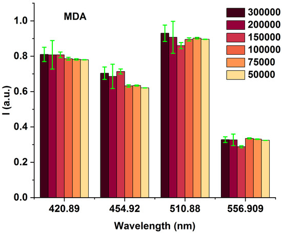 MDAs show an increased NADH fluorophor significantly at around 454 nm and FAD at 510 nm emissions. Compared to each other, most likely they could be related to different other fluorophores [8,50]. The minimum number of cells is 50,000 (early BC), which is targeted to evaluate the detection ability of the fluorescence platform preclinical assays. It shows the comparison of the lowest fluorescence intensity compared to 300,000 (advanced BC) on different wavelengths of 420, 545, 510, and 556 nm, admitting that any MDA cellular changes (metabolism) [25,42] could cause fluorescence variations, and clarify fluorescence’s ability to detect, especially in early BC.