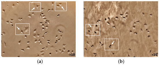 Cellular morphology of MDA cancer cells monitoring at 50,000 number of the cell before 5-ALA administration (a) and after 1 mM of 5-ALA treatment (b) for 48 h by phase-contrast photos. The white arrows indicate appearance and the polygonal structural changes of the cells before 5-ALA administration (a), whereas they become round after 5-ALA administration (b) (cell death).