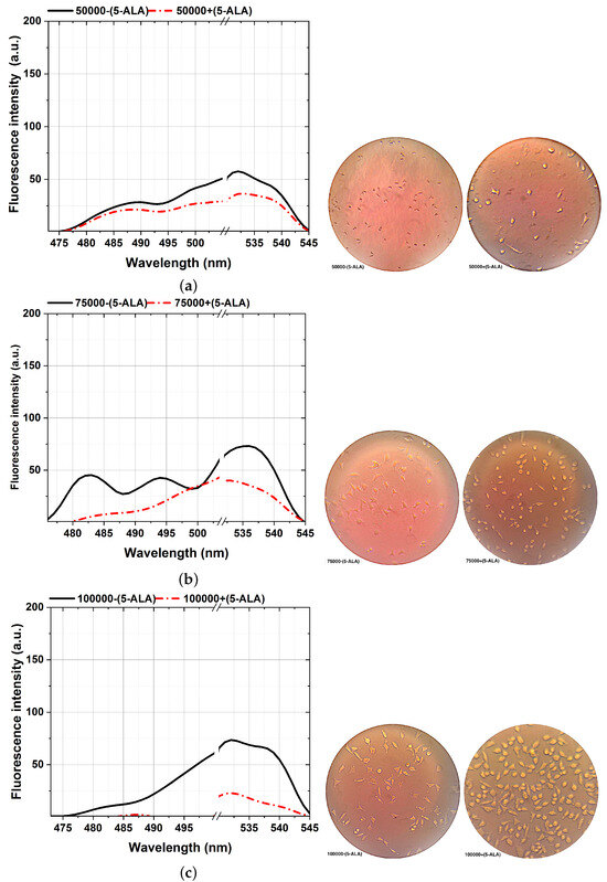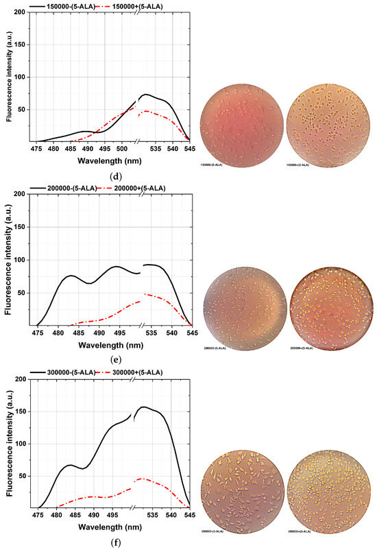 Comparison of the fluorescence spectra (left plots) and various MDA cellular shapes (right photos) from different cell counts: 50,000 (a), 75,000 (b), 100,000 (c), 150,000 (d), 200,000 (e), and 300,000 (f) assisted with and without 5-ALA treatment, excited at 405 nm. Scale bars, 100 mm. Each measurement was tested in three independent experiments (n = 3).