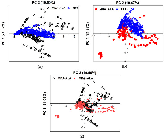 The higher concentration of hollow blue triangle for HFFs rather than MDA-(5-ALA) indicates that the obtained fluorescence spectra of HFF are reproducible, irrespective of measurements. The clear separation of the HFF data (triangles) and from the MDAs (circles) indicates that the obtained fluorescence spectra of HFF can be separated from MDAs. The fact that the dispersion of the data in the case of MDA+ (5-AlA) has more similarity to the HFFs (with the first principal component 84.99% of the total variance in the fluorescence spectra of Figure 7b) is also taken into consideration.