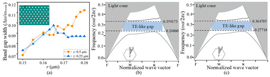 Figure 1a shows the normalized band gap width /, where is the band gap width and is the center frequency of the band gap. The normalized band gap width is given with respect to . The inset of Figure 1a can find the PhC slab prototype with structural parameter definitions, in which r is the radius of the air holes and a is the lattice constant. We keep a at 0.51 μm, z at 0.5 μm, and vary the radius value r from 0.15 μm to 0.18 μm. The normalized band gap width increases from 0.068911 to 0.116214 while we increase r. Moreover, when z is at 0.25 μm, a is at 0.515 μm, and we vary r, the normalized band gap width increases from 0.073506 to 0.087118. Based on the simulation analysis results, we obtain the optimized wide band gap for silicon-based PhC structures operating in the ~1550 nm wavelength range, as shown in Figure 1b,c. In such a case, the following structural parameters are chosen: a = 0.51 μm, r = 0.178 μm, z = 0.5 μm; and a = 0.515 μm, r = 0.178 μm, z = 0.25 μm.