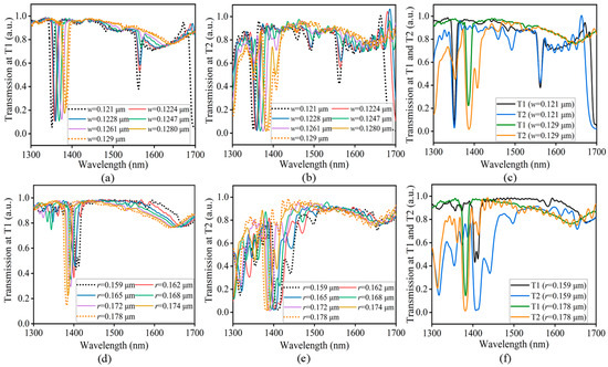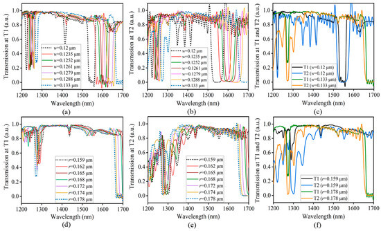 Influence of w and r on the transmission rates and passband regions of 2D silicon-based PhC waveguides. (a,b) illustrate the impact of w on the transmission rates and passband region for a z of 0.25 μm slab thickness. (c) depicts the comparison of w for T1 and T2. (d,e) illustrate the effect of r on the transmission rate and passband region. (f) demonstrates the comparison of r for T1 and T2.