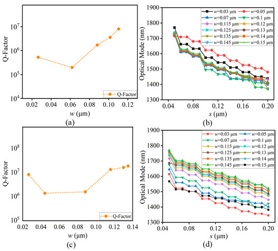 Analysis of the relationship between w and the Q-factor, as well as the impact of w and s on the optical mode characteristics for different slab thicknesses. (a,c) show a simulated Q-factor concerning w for z = 0.5 μm and 0.25 μm. (b,d) show the effect of w on the optical mode along with s.