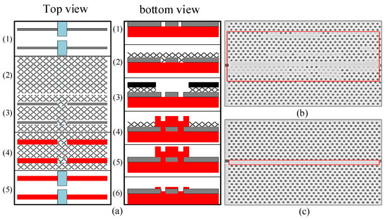 Comprehensive overview of the fabrication steps involved in creating PhC structures. (a) illustrates the fabrication process with top and bottom views; (b,c) present the SEM images of PhC etching defects, indicating the leakage of engraved air vias and air grooves.
