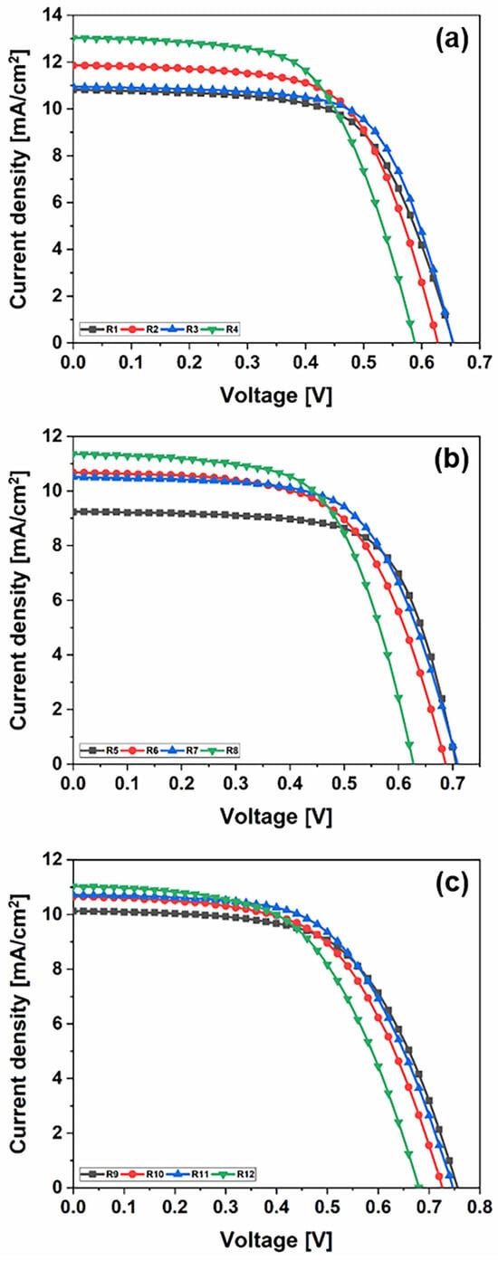 The R3 cell, employing a slightly higher molecular weight of PVDF-HFP (90,000 g/mol), demonstrated a 9% efficiency reduction after 600 h, similar to the R1 cell. This cell exhibited a moderate Voc increase of 4%, a slight FF improvement of 1%, and a Jsc decrease of 13%. These results suggest that this specific polymer molecular weight might offer a balance between suppressing recombination and maintaining reasonable charge transport properties.