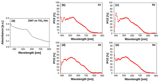 (a) UV–Vis absorption spectrum of Z907 dye on TiO2 film and quantum efficiency spectra for (b) R1—DMPII, (c) R2—DMPII + PVH70, (d) R3—DMPII + PVH80, and (e) R4—DMPII + PVDH-HFP Z907 sensitized solar cells.