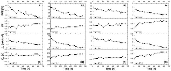 Stability study for more than 600 h at ambient conditions of the (a) R1 DSSC based on the DMPII liquid electrolyte and of the QsDSSCs using PVDF-HFP with different molecular weights: (b) R2—DMPII + PVH70, (c) R3—DMPII + PVH80, and (d) R4—DMPII + PVDH-HFP. All solar cells were sensitized with the Z907 dye.