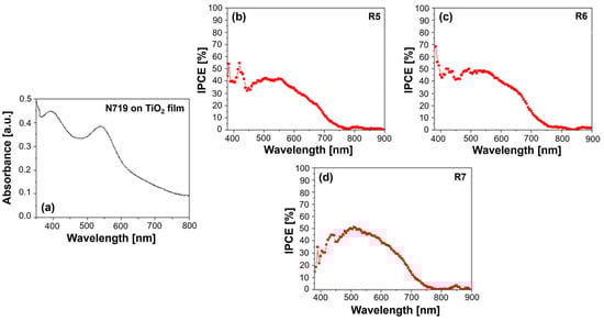 (a) UV–Vis absorption spectrum of N719 dye on TiO2 film and quantum efficiency spectra for (b) R5—DMPII, (c) R6—DMPII + PVH70, and (d) R7—DMPII + PVH80 N719 sensitized solar cells. The quantum efficiency data of the R8—DMPII + PVDH-HFP cell are not available due to the degradation of the device.