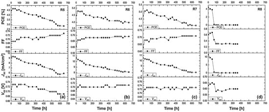 Stability study for more than 600 h at ambient conditions of the (a) R5 DSSC based on the DMPII liquid electrolyte and of the QsDSSCs using PVDF-HFP with different molecular weights: (b) R6—DMPII + PVH70, (c) R7—DMPII + PVH80, and (d) R8—DMPII + PVDH-HFP. All solar cells were sensitized with the N719 dye.