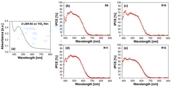 (a) UV–Vis absorption spectrum of 2-LBH-92 organic dye on TiO2 film and quantum efficiency spectra for (b) R9—DMPII, (c) R10—DMPII + PVH70, (d) R11—DMPII + PVH80, and (e) R12—DMPII + PVDH-HFP 2-LBH-92 sensitized solar cells.