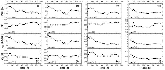 Stability study for more than 600 h at ambient conditions of the (a) R9 DSSC based on the DMPII liquid electrolyte and of the QsDSSCs using PVDF-HFP with different molecular weights: (b) R10—DMPII + PVH70, (c) R11—DMPII + PVH80, and (d) R12—DMPII + PVDH-HFP. All solar cells were sensitized with the phenothiazine organic dye 2-LBH-92.