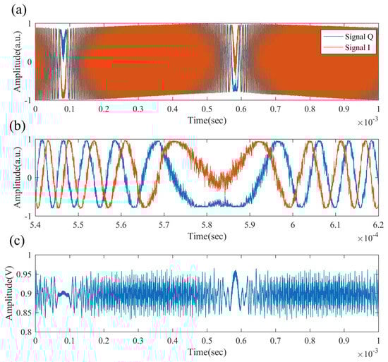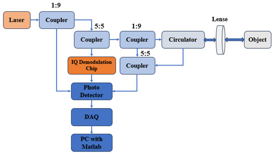 Figure 2, features an all-fiber structure. The light source employs a standard commercial distributed feedback (DFB) laser with a central wavelength of 1310 nm and a linewidth of 200 kHz. The laser is driven by the CTL200 butterfly laser driver from Koheron, and a function generator produces a sinusoidal signal with a modulation period of 1kHz and modulation amplitude of 0.65 Vpp. After passing through a coupler, a portion of the light source signal enters an IQ demodulation chip. This chip includes a 7 m delay line Mach–Zehnder (MZ) interferometer, which extracts the frequency information of the sinusoidal frequency-modulated signal through IQ demodulation for further data processing.