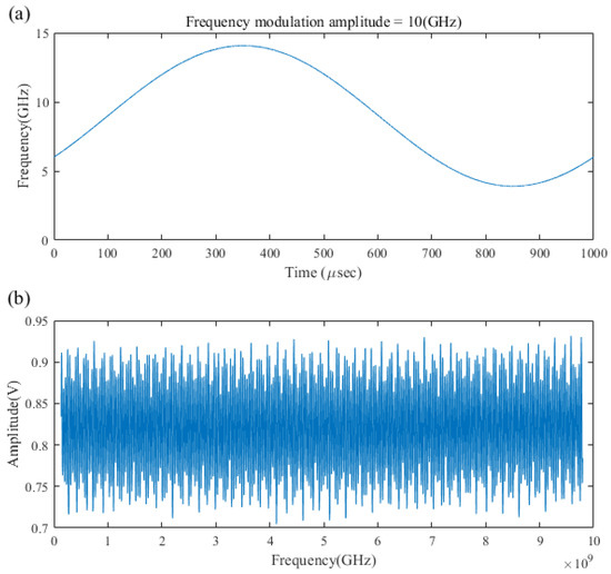 corresponding to the phases of the local oscillator signal and the echo signal, respectively. This formula includes the DC component of the interference signal, the harmonic frequency term, the sum frequency term, and the difference frequency term. Since the DC component of the signal does not contain distance information about the measured target, it can be filtered out. The optical frequencies of the harmonic frequency term and the sum frequency term, typically on the order of hundreds of THz, far exceed the frequency response range of the photodetector and can, therefore, be disregarded. When the difference frequency term falls below the cutoff frequency of the photodetector, it results in the generation of a photocurrent signal. Consequently, the interference signal received by the detector, after filtering out the DC component, is expressed as follows: