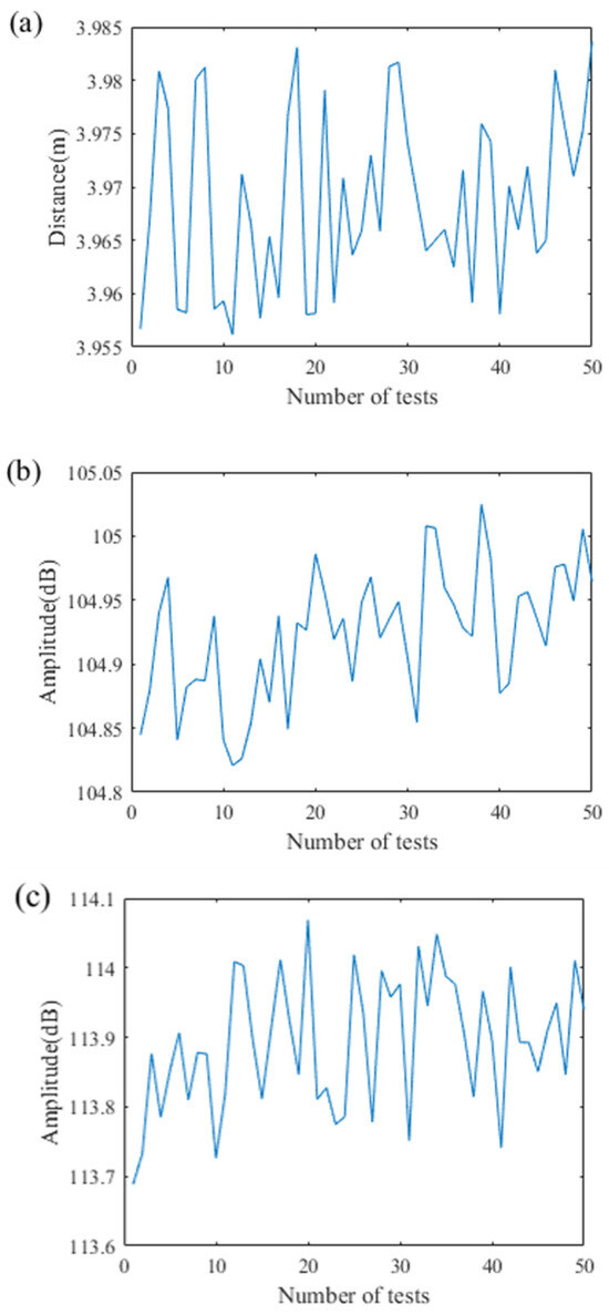The remaining portion of the signal passes through a 1:9 coupler and functions as both the local oscillator and the main beam of the test system. The ranging main beam, after passing through a polarization-maintaining circulator, is emitted into the object space by a lens. The target object, a diffuse reflection board with 75% reflectivity, has a surface that is characterized as a uniform Lambertian surface. The main beam, reflected by the object, returns along its path to the circulator and merges with the local oscillator light at the balanced photodetector. The differential amplification circuit within the balanced photodetector effectively suppresses the common-mode signal and amplifies the differential-mode signal. Consequently, balanced detection effectively suppresses the DC component of the beat frequency signal and enhances the interference signal. The photodetector (PD) module, as shown in the figure, consists of three single-ended photodetectors and one balanced photodetector. All optical signals received by the PD are converted into digital signals by a digital acquisition card and subsequently processed and analyzed by a computer.