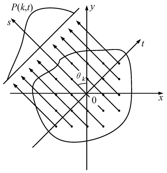 The basic idea of the optical tomography reconstruction algorithm is using a detector to collect the radiation projection distribution of a tested field at an appropriate angle, reconstructing the field according to the projection distribution; furthermore, the reconstruction of the field is also the reconstruction of the original function from the line integral. As shown in Figure 1, is the tested field, x-y is the right-angle coordinate system, s-t is the coordinate system after rotating the x-y coordinate axis along the counterclockwise direction by an angle of θk, which is also the projection angle, and the projection P(k,t) of f(x,y) along the k th angle is expressed using the following equation: