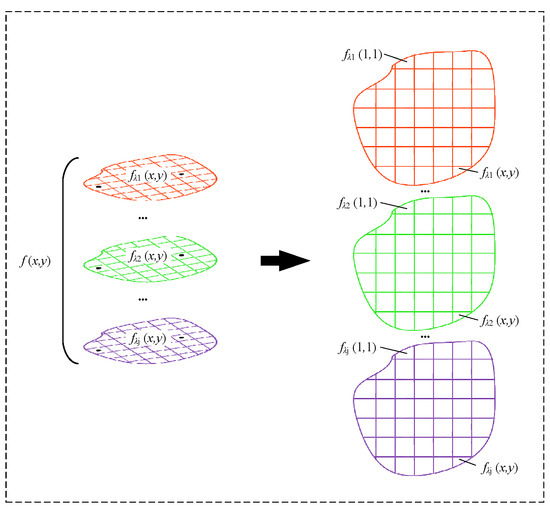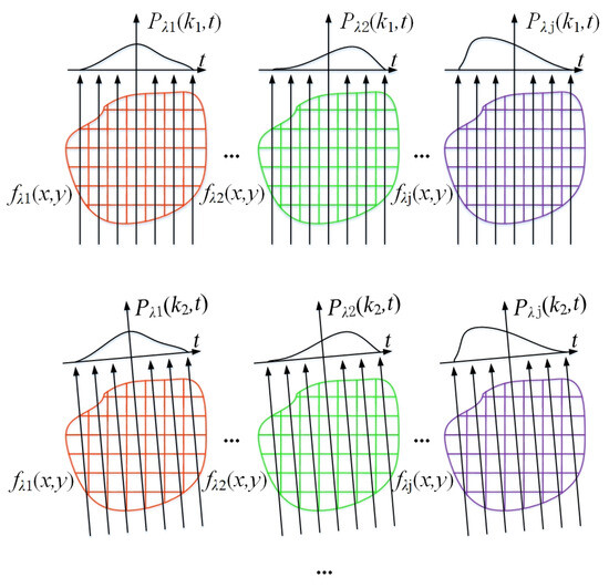 where , , and represent the temperature of the first, second, and m sub-regions at wavelength , respectively. At present, due to technical limitations, the radiation of each point cannot be directly obtained from the corresponding region of the temperature field via any technical means, and only the line integral of the radiation in the measurement direction can be obtained from one end of the temperature field. Therefore, combining temperature measurement technology with chromatographic reconstruction technology, following [15], the temperature field shown in Figure 2 is divided into a multi-band radiation field, as shown in Figure 3, by adding in the spectral separation technique.