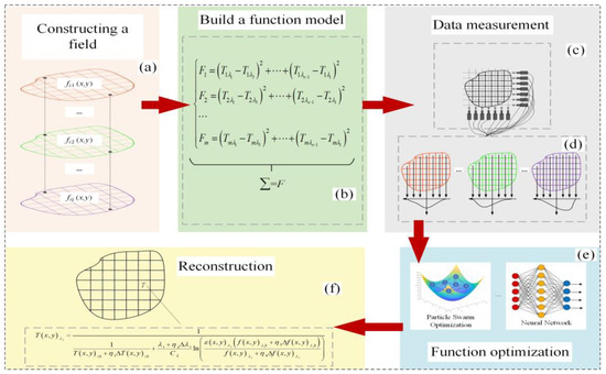 The process of temperature field reconstruction: (a) constructing a field; (b) building a function model; (c) data acquisition; (d) projection data processing; (e) function optimization; (f) temperature field reconstruction.