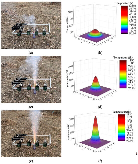 Figure 8a,c,e show the combustion conditions of black powder at 1.1 s, 2.3 s, and 4.5 s after ignition, respectively; Figure 8b,d,f show the results of the corresponding measurement data after data processing and data fitting. An infrared thermometer with a temperature-measuring range of −25~3000 °C, adjustable spectral emissivity, and a measuring error of ±2% was used to measure the central peak temperature at 1.1 s, 2.3 s, and 4.5 s during the combustion of black powder. The accurate error of the method in this paper was calibrated, and the results were 12.1%, 5.7%, and 13.4%. It can be seen that the experimental measurement results are consistent with the combustion of black powder and basically record the whole process of black powder combustion. Therefore, the temperature field measurement method described in this paper can realize the actual measurement of the temperature field under two projection angles.