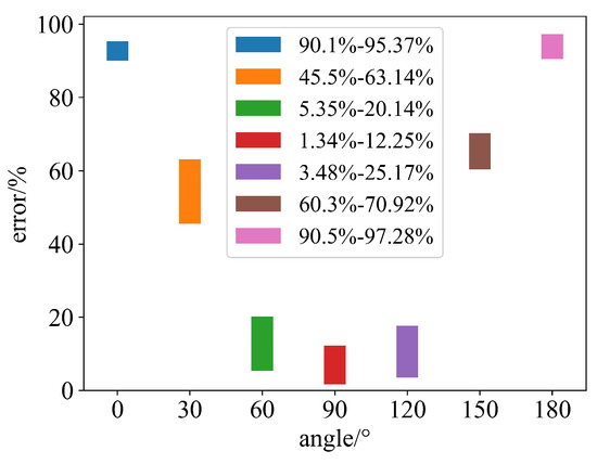 It can be seen from Figure 7 that the temperature field can be reconstructed under two projection angles by using the tomography reconstruction method described in this paper, and the temperature distribution is basically consistent with the tested field. In order to evaluate the accuracy of the reconstruction method, the error calculation formula shown in Equation (12) is used to evaluate the accuracy of the method.