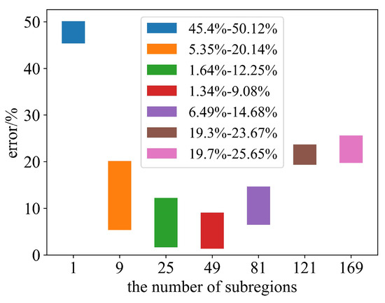 It can be seen from the abovementioned experimental setup that the figures shown in the experimental process are the results of surface fitting, so there are interpolations in the reconstructed temperature field results. When the number of temperature field sub-regions is small, there is a large error in interpolation, so the error is larger. When the number of sub-regions of the temperature field increases, interpolation will smooth the surface without introducing errors, so the errors will decrease sharply when the number of sub-regions exceeds 9; when the number exceeds 49, the errors begin to increase, because when the number of sub-regions exceeds a certain amount, the calculation amount of the optimization algorithm will increase sharply, and the efficiency and accuracy will be affected to a certain extent. Therefore, it can be seen from the Figure 10 that when the number of sub-regions changes from 1 to 169, the reconstruction accuracy first becomes smaller and then larger and tends to be stable when the number of sub-regions exceeds 121, with the highest accuracy obtained at 49.