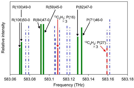Optical frequency standards [1] in telecommunication wavelength bands are useful not only for the management of the channel frequency of Dense Wavelength Division Multiplexing (DWDM) systems but also for other applications, including precision measurement and satellite communication. Besides acetylene [2,3,4] and Rb [5,6] optical frequency (or wavelength) standards, optical frequency standards at telecommunication wavelengths have recently been developed using frequency-stabilized lasers based on the precision spectroscopy of molecular iodine [7]. The acetylene optical frequency standard uses an optical cavity in the spectroscopic system. Therefore, this system is not reliable enough for long-term operation because the optical cavity is sensitive to environmental vibration. The Rb optical frequency standard uses a magnetic shield in the spectroscopic system, which is relatively difficult to handle, to reduce the frequency shift of the spectrum due to the magnetic field in the environment. The iodine-based optical frequency standard at the telecommunication wavelength has the advantages of a simple setup and reliability (without an optical cavity or magnetic shield in the spectroscopic system) over acetylene and Rb standards. Precision spectroscopy was performed on three iodine lines [8] (blue dashed lines in Figure 1) close to the tripled frequency of the P(16) line of 13C2H2 (red line in Figure 1), which is recommended by the International Committee for Weights and Measures (CIPM) as an optical frequency standard at telecommunication wavelengths [9]. We also measured the hyperfine structure of the seven iodine lines in the same wavelength region (six of them have the same excited-state vibrational quantum number v′ = 44) to study the rotation dependence of the excited state hyperfine constants [10]. These seven lines are shown in Figure 1 as blue dot-dashed lines (two of them are close and overlap in Figure 1). As shown in Figure 1, there are several other iodine lines with excited-state vibrational quantum numbers other than v′ = 44 and, in some cases, relatively low intensity (green lines in Figure 1) [11]. They are the R(106)50-0, R(100)49-0, R(84)47-0, R(59)45-0, P(82)47-0, and P(71)46-0 lines of 127I2 at 514 nm. These lines have not been investigated using Doppler-free laser spectroscopy, and their hyperfine structures have not yet been resolved. The absolute frequencies of these lines were only measured for the Doppler-limited line (an overlap of all the Doppler-broadened hyperfine structures in the line) center using Fourier transform spectroscopy with an uncertainty of several tens of megahertz [11].