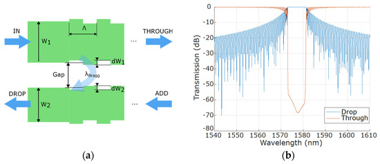 Although this component presents clear advantages in comparison to other demultiplexing structures or systems, like the elimination of free spectral range and input and output signal separation within a single structure, it is highly sensitive to fabrication deviation, due to the implementation of a narrow gap (with typical values of 150–250 nm) between waveguides and corrugations on both edges of both waveguides (values around 30 nm to 90 nm in height and 75 to 150 nm in width). It also has a very limited response variation to applied active tuning [5,6]. It is therefore extremely hard to optimize with no previous experimental data to derive from, and impossible if a correction model is not even used.