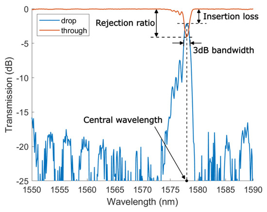 The devices were characterized through grating couplers using a broadband source and an optical spectrum analyzer at the input and output, respectively. The drop and through spectra were acquired. Figure 2 shows an example of a device’s spectra and the relevant figures of merit calculated.