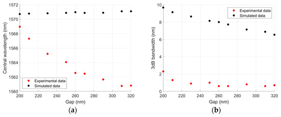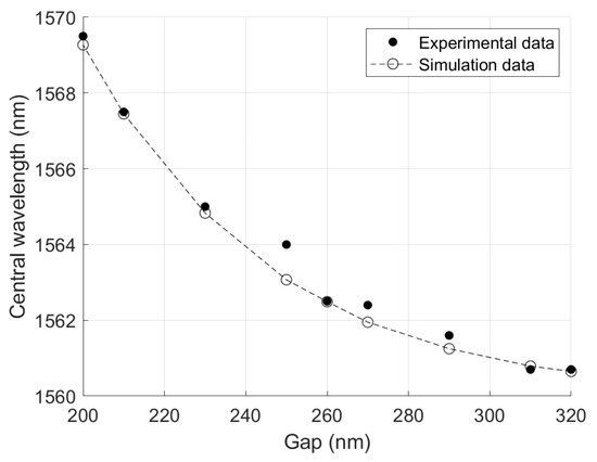The results obtained through this model are present in Figure 5, where it is visible that the simulations present similar results to what was obtained experimentally, with a correlation coefficient of between the experimental and simulation central wavelength data. This means that the hypothesis proposed to explain the experimental behavior observed in the devices with different gaps is valid.