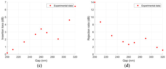Experimental results of (a) central wavelength, (b) 3 dB bandwidth, (c) insertion loss and (d) rejection ratio with gap variation.