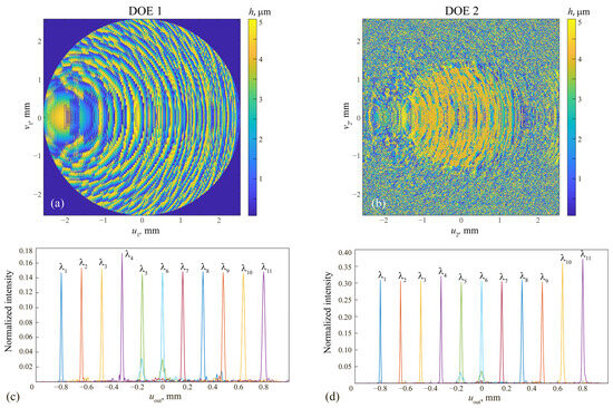 (a,b) Diffractive microrelief height functions of the DOEs calculated with optimization with respect to the parameters , , and the normalized intensity distributions generated at the design wavelengths by the first DOE (c) and the cascade of two DOEs (d).