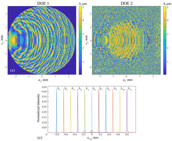 In the proposed method, the calculation of DOEs constituting the cascade is carried out sequentially. Figure 2a shows the diffractive microrelief height function of the first DOE calculated by pointwise optimization using Equation (9). According to the design approach, the first DOE by itself already focuses the incident beams with the given operating wavelengths (10) to the required points. In this regard, Figure 2c shows the intensity distributions generated by the first DOE along the uout axis in the output plane containing the focusing points. Let us note that here and in what follows, for the calculation of the generated distributions, the sinc-method from ref. [26] was applied with calculation grids with a step of 2.5 μm. In these calculations, each DOE pixel with the side length of 10 μm was represented as a matrix of pixels with the size of . The distributions presented in Figure 2c are normalized by the values