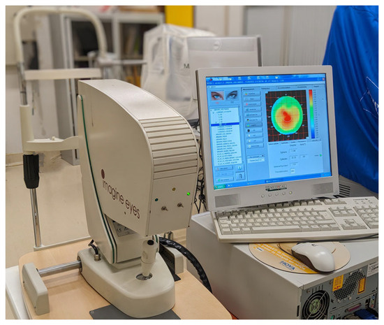 The IRX3 commercial Shack–Hartmann aberrometer (Imagine Eyes, Orsay, France) was used in this study to record the ocular wavefront (Figure 1). The Shack–Hartmann technique is the most often used wavefront-sensing method for assessing the optical quality of the eye [17]. In this procedure, when a subject is gazing at the fixating target that is placed inside the device, a laser beam is sent into the eye and it is reflected back from the fovea while its wavefront is aberrated due to the optics of the eye. Then, the beam is divided into multiple beams passing through an array of microlenslets, so beam spots can be recorded on a charge-coupled device. In order to determine the shape of the wavefront, one can compare the position of each spot to its non-distorted location; displacements in the x and y directions are related to the local derivative (slope) of the wavefront [18]. For the given pupil size, the device’s software can fit the observed wavefront and generate Zernike coefficients.