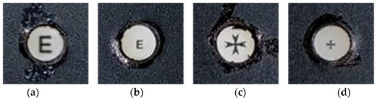Different fixation targets used while measuring eyes aberrations: (a) bigger E-letter; (b) smaller E-letter; (c) bigger Maltese cross; (d) smaller Maltese cross.
