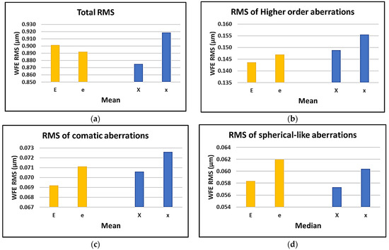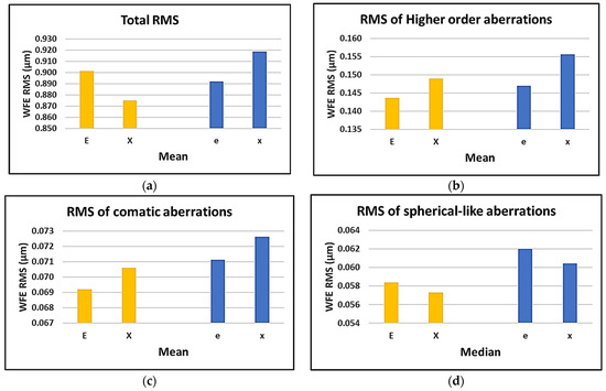 It can be seen that choosing the bigger Maltese cross gave the least total RMS of the aberrations and the lowest RMS of the spherical-like aberrations; however, the bigger E-letter yielded the lowest RMS of the HOA and the lowest RMS of the comatic aberrations. All the charts show that by shifting the gaze from the fixation target of “X” to “x”, an increase in the RMS values is expected. The same trend can be found when changing the gaze from the fixation target of “E” to “e”, except for the total RMS of the aberrations.