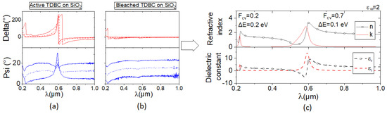 First, we clearly see that the Psi and Delta measurements exhibit two main transitions at 590 and 220 nm, as expected [21]. The 590 nm energy corresponds to the HUMO-LOMO fundamental transition, which is well documented in the literature [1,2,3,4,5,6,7]. The 220 nm transition is identified as the second absorption transition of the molecule, detectable by ellipsometry due to its high oscillator strength. Such absorption bands have already been used for comparing Raman spectroscopy in active and bleached TDBC [21]. As expected, only the fundamental transition is removed by the bleaching, probably because the layers were bleached in the visible range, as studied in ref [21]. Figure 2c shows the extracted refractive index with the n and k formalism (Equation (1)) fitted with the ellipsometry data. We found an oscillator strength of around 0.7 for the 590 nm energy and 0.2 for the 220 nm transition. The oscillator strength of the fundamental transition is in good agreement with the literature for pure TDBC [3,5,6,7] (i.e., without PVA in Table 1). For the absorption spectral width (Table 1) ΔE, we found a larger value of 0.1 eV compared to the literature, probably due to the thickness variation evaluated at around 5 nm by the fit for a fixed thickness of 17 nm (as previously reported by Plasmon fitting [16]). Since the ellipsometry fitting is highly dependent on the thickness evaluation, it could be interesting to compare such results to other methods.
