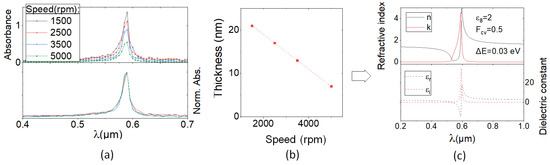 Figure 3a shows the dispersive absorption measured in TDBC layers with different thicknesses. These layers were fabricated with the same recipe as described previously but with different spinning speeds at the last processing step, ranging from 1500 to 5000 rpm. As expected, the absorbance decreases with higher spinning speed according to the formation of thinner layers [22]. In order to evaluate the layer thickness, we assume a layer thickness at 17 nm (as previously reported by Plasmon fitting [16]) for the 2500 rpm speed. Thickness is indeed difficult to evaluate accurately since it is a soft material difficult to micro-pattern. Since the normalized absorption spectral width does not change between different speeds (bottom part of Figure 3a), we assume the same refractive index for all the layers. The other layers’ thicknesses were estimated by extrapolation based on the absorbance at 590 nm. The layer thickness as a function of the spinning speed showing a linear dependence is presented in Figure 3b. In Figure 3c is the calculated refractive index using both formalisms: n-k (Equations (2) and (3)) and ε (Equation (4)). These results show a better agreement with the literature compared to ellipsometry measurements, but the result remains highly sensitive to the thickness evaluation (Equation (5)), as presented in Figure 3b.