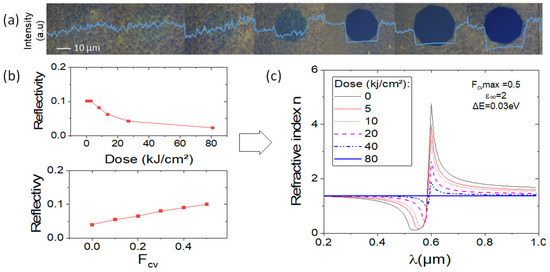 Figure 4a presents different microstructures fabricated on SiO2 with similar fabrication steps presented in Section 3.1, with different doses of insolation. For the insolation process, a Nikon microscope equipped with a white lamp focused on the layer with a 50x objective and a diaphragm were used with doses ranging from 0 to 80 kJ/cm2. From such images, reflectivity was evaluated using grayscale extraction with ImageJ software. The average image intensities over 10 pixels in the center of each image are plotted in image 4a in blue color. By considering a theoretical averaged reflectivity R of 10% in the non-insolated part of the layer (calculated with Mathematica Wolfram software), R in the insolated region as a function of the dose (D) (used in Figure 4a) is plotted in Figure 4b. As previously reported, reflectivity decreases with the dose [15].