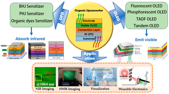 IR upconversion is a process where infrared photons are absorbed and converted into higher-energy visible photons. There are different mechanisms of IR upconversion. Based on nonlinear optical effects, this process can be efficiently achieved through various advanced methodologies. One common approach involves the use of a probe light—typically a coherent laser source—that interacts with a nonlinear crystal [19]. The crystal, often composed of materials such as lithium niobate or beta-barium borate, exhibits strong nonlinear optical properties, enabling the conversion of infrared photons to visible wavelengths through processes like second harmonic generation (SHG) or sum-frequency generation (SFG). Additionally, the nonlinearity of the detector itself can be exploited in some systems [20], where materials within the detector exhibit inherent nonlinear responses to the incident infrared radiation. This allows for the direct upconversion and detection of infrared light within a single integrated device, potentially enhancing the efficiency and sensitivity of the detection process. Moreover, the development of organic nonlinear crystals has opened new avenues for IR upconversion [21]. These organic materials offer several advantages, including high nonlinear optical coefficients, tunability of optical properties through chemical modification, and compatibility with flexible and lightweight devices. As a result, organic nonlinear crystals are becoming increasingly important in the design of innovative IR upconversion systems, particularly in applications requiring flexibility and integration with organic electronics. In this review, we mainly introduce the upconversion device based on PD and LED. The upconversion mechanism involves the sequential absorption of two or more low-energy photons by a sensitizer, followed by energy transfer to an emitter, resulting in the emission of a single higher-energy photon. The outline diagram in organic upconversion devices is summarized in Figure 1. The main types of sensitizers include bulk heterojunction sensitizers, planar heterojunction sensitizers, organic dyes sensitizers, and so on, which absorb infrared light. The upconverter consists of multiple layers, including the substrate, infrared OPD, connection layer, and visible OLED, arranged in a stacked architecture. The visible OLED, which can be fluorescent, phosphorescent, TADF, or tandem OLED, then emits visible light.